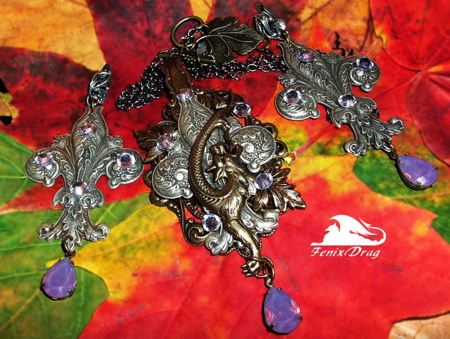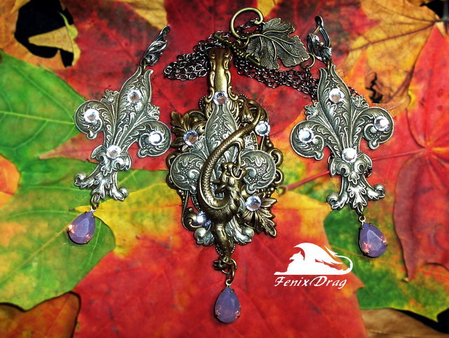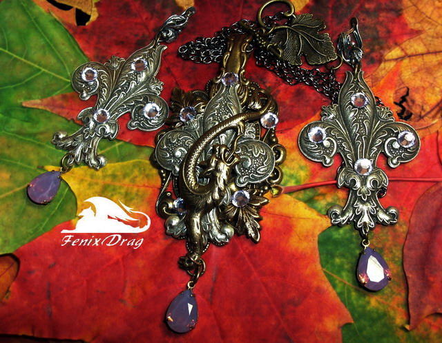 Кулон и большие длинные серьги "Аленький цветочек" в стиле Винтаж (Винтажный, Старинный стиль, под старину)