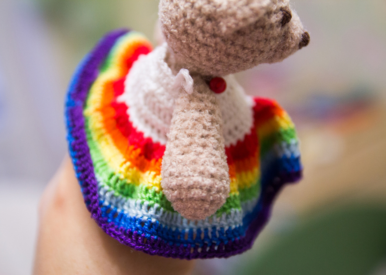 У нее очень приятная ворсистая шерстка. Платье съемное, на двух пуговичках. Юбочка яркая как радуга.