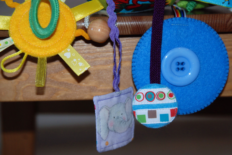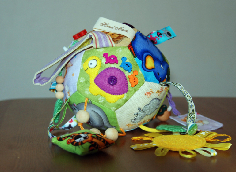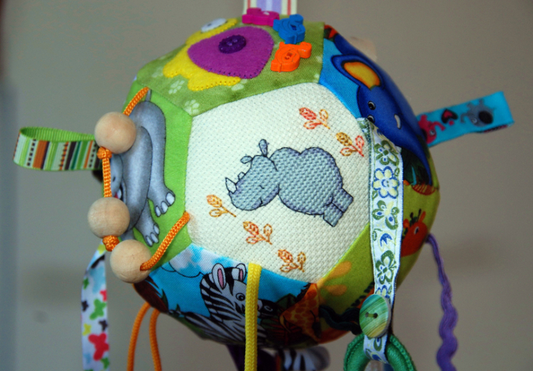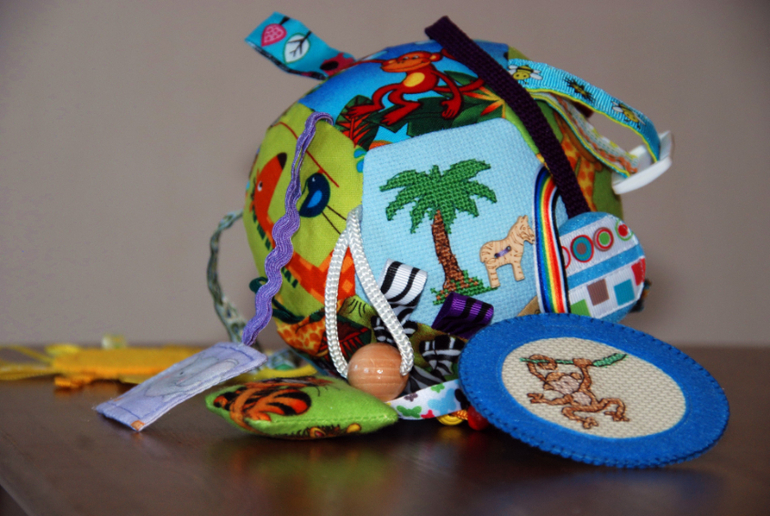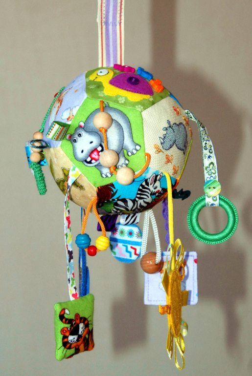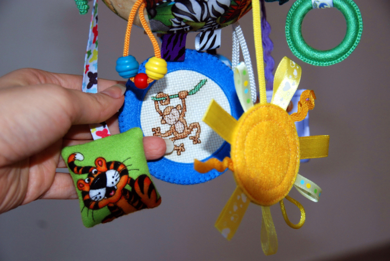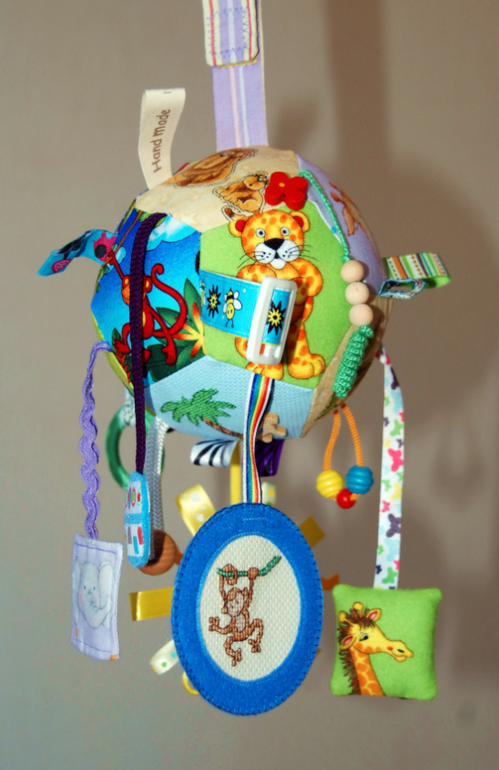 Сам мяч сшит из хлопка и мягкой фланельки. Без вышивки я, конечно, не могу, поэтому некоторые детали вышиты крестом - обезьянка, носорог и пальма(тем более, что канва с вышивкой так приятна на ощупь))) Черепашка выполнена из фетра. Висюлек разных много, они все крупные. Солнышко из фетра с разными ленточками, зелёная подушечка с тигром и жирафом набита синтепоном, сиреневая - шуршит. голубая - с репсовыми лентами.
