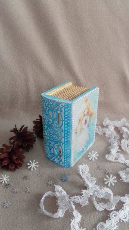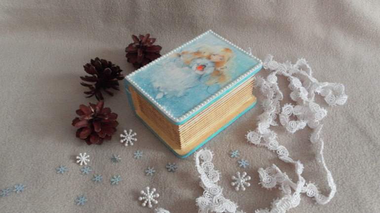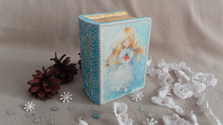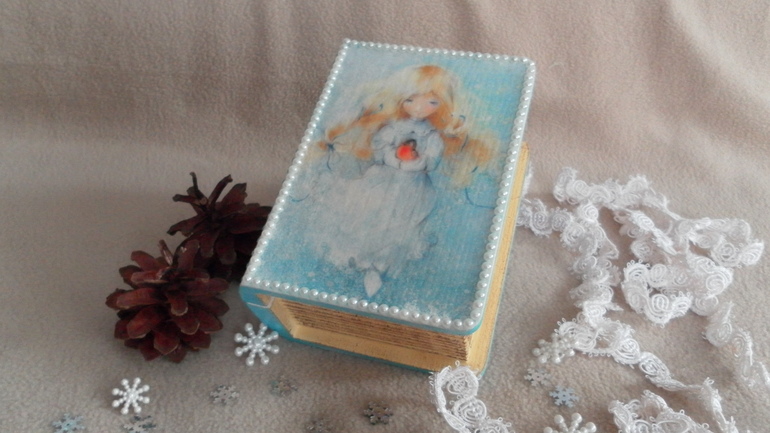 Декупажищет хозяина. Шкатулочка в форме книжки с нежной девочкой на форзаце. Может стать замечательным подарком на НГ. Размеры 13*9*6,5 см. Прямой декупаж с распечаткой, акриловые краски, лак и шпаклевка, оформление полубусинами. Внутренняя часть оклеена фетром. Под катом МНОГО фото.