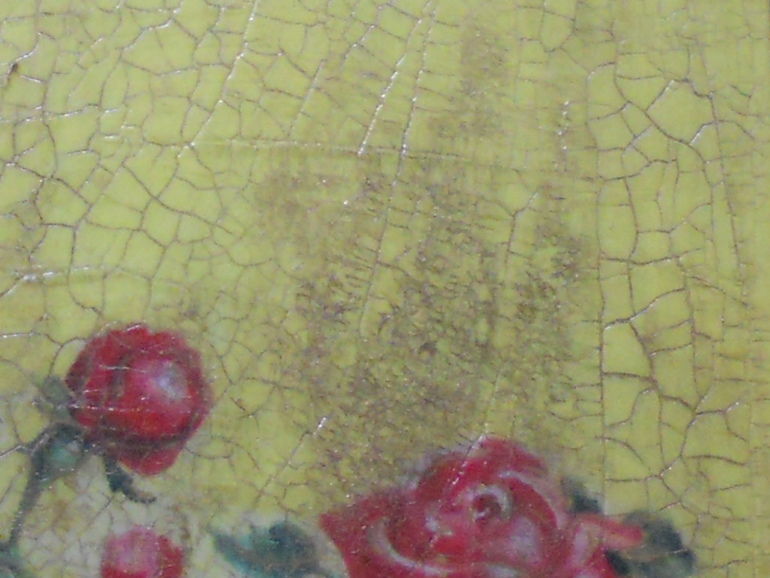 Не совсем удачно лег кракелюр, не надо было в таком случае втирать в трещины везде( не знаю что вы втирали), а втирать только в удачные места..получилось грязновато. Но это можно обыграть) типа старая совсем вещь, не вижу втерто ли в розах) модно втереть белым, если в них втереть темным- будет совсем темно) не знаю, понятно ли объяснила, ну и вокруг рисунка немного тени навести или имитацию и края доски тоже "зачпокать"...