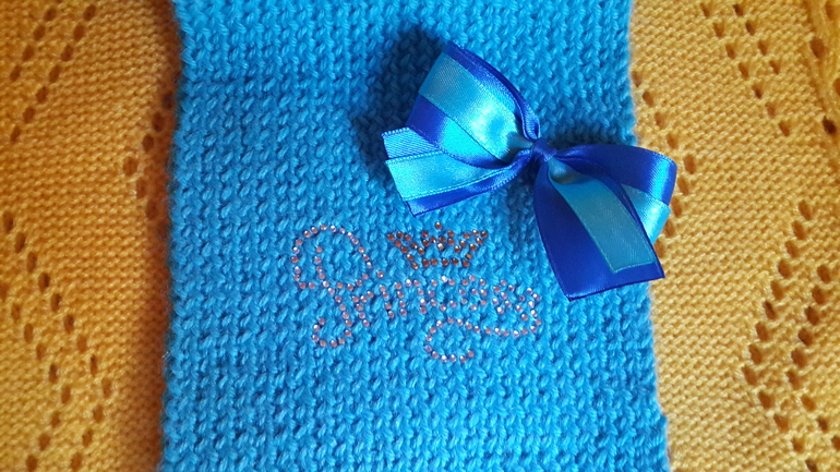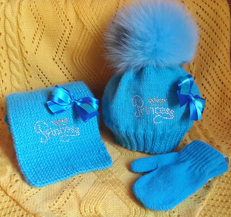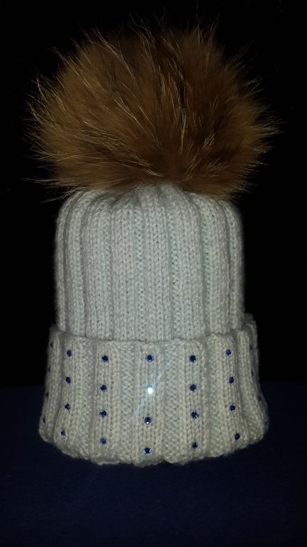 Шапочка ручной работы со стразами и натуральным помпоном на ОГ 51-54 (можно чуть больше или меньше за счет вязки резинкой). Цвет серо-голубой.