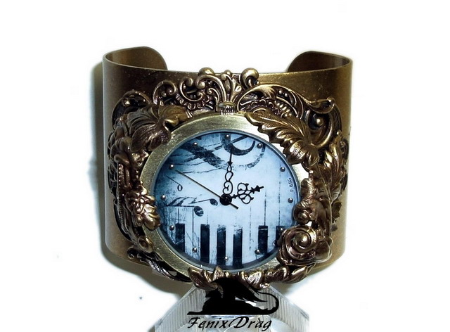 Широкий браслет "Звуки старого рояля" с часами с изображением пианино