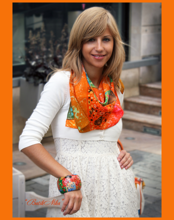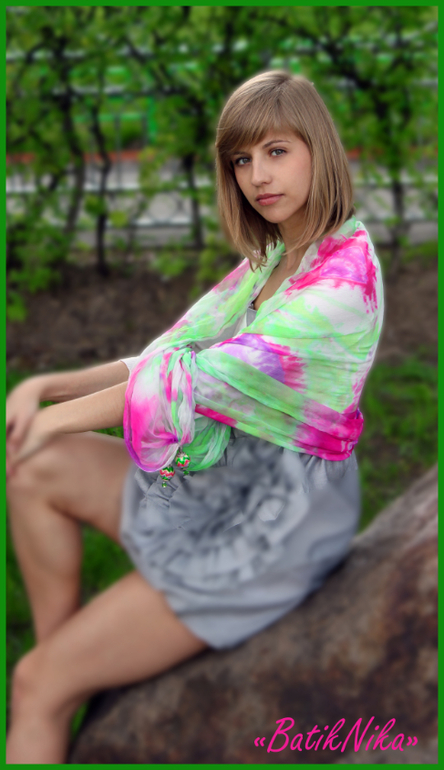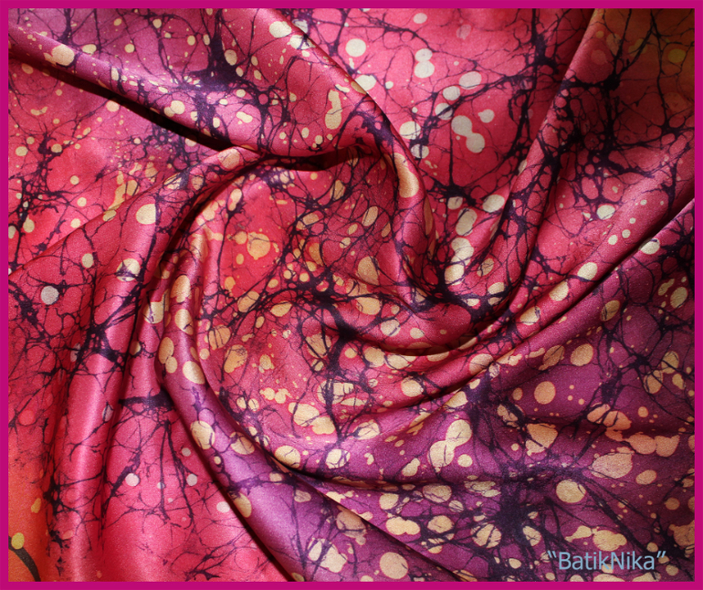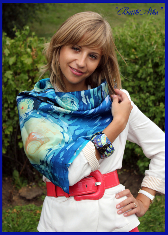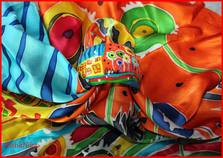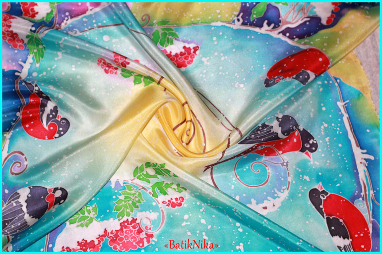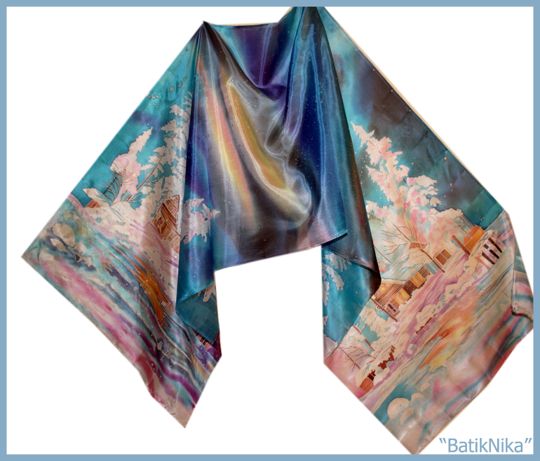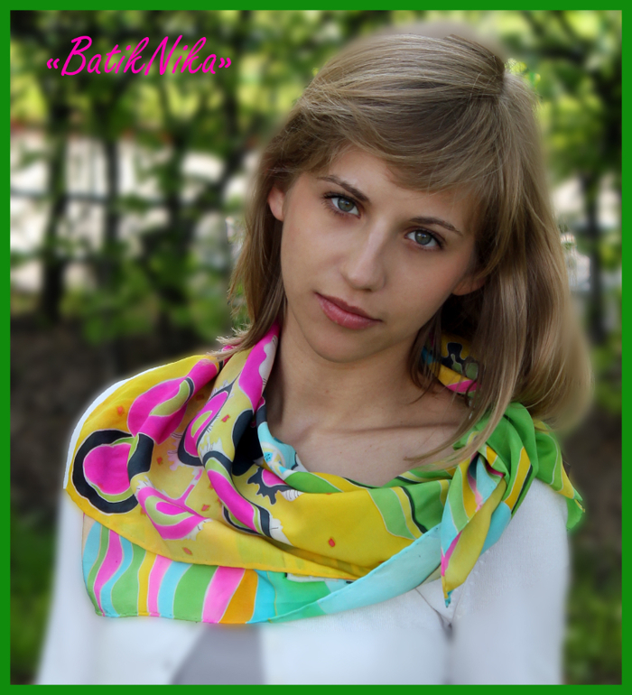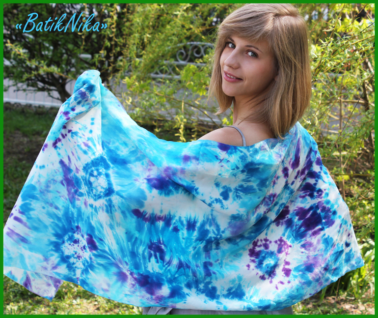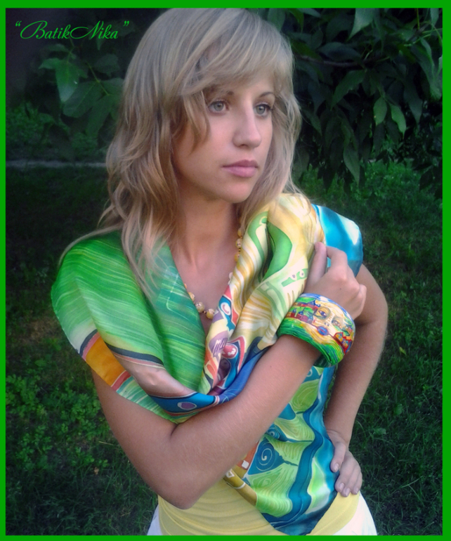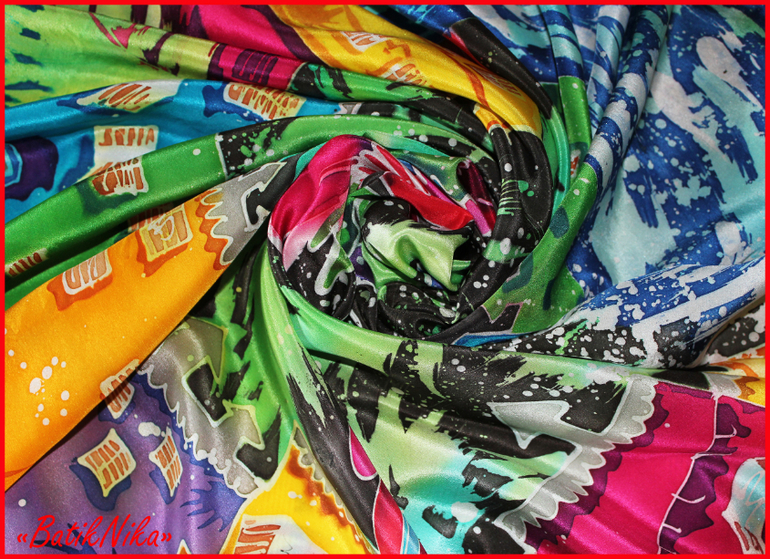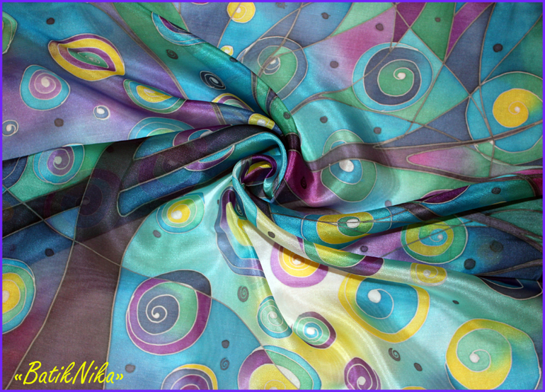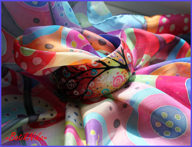 Все выполнено на натуральном шелке, роспись вручную в разных техниках. Возможна роспись не только шелка, были зонтики, браслеты деревянные и даже обувь :)