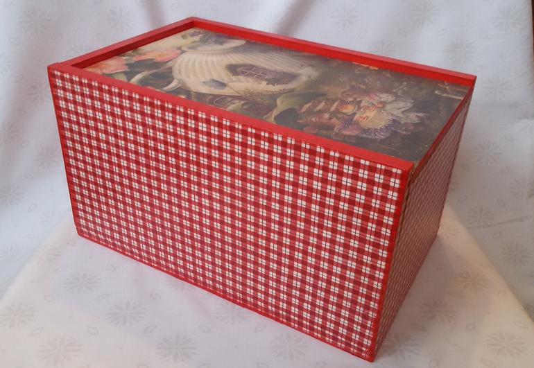 Материалы: деревянная коробка, грунт, акриловый лак, салфетка, распечатка, акриловые краски.