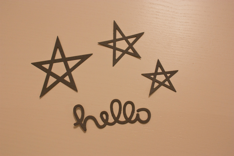6. Три звезды и hello. Материал - темно-серая бумага для пастели плотностью 160 г/м2. Размер звезд (в см.): 7*6, 5*5, 4*4. Размер hello: 7,2*2,8. Цена за наборчик 35р.