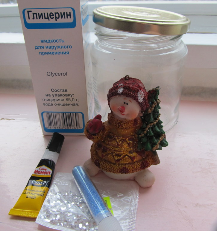 Хорошо моем банку, выливаем туда глицерин с водой в пропорции 1:1 (чем больше глицерина, тем дольше снежинки кружатся), насыпаем блёстки (иногда насыпают молотую яичную скорлупу, но мне не понравился эффект). На крышку (с внутренней стороны) приклеиваем нашу игрушку. Аккуратно завинчиваем (банка должна быть наполнены не до самых краёв, т.к. игрушке тоже нужен объём). Если банка не герметична, то можно замазать края герметиком. ВСЁ.