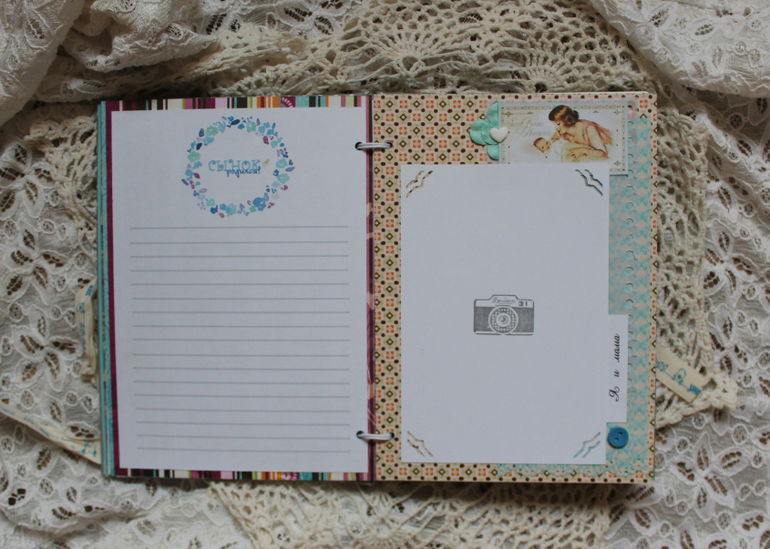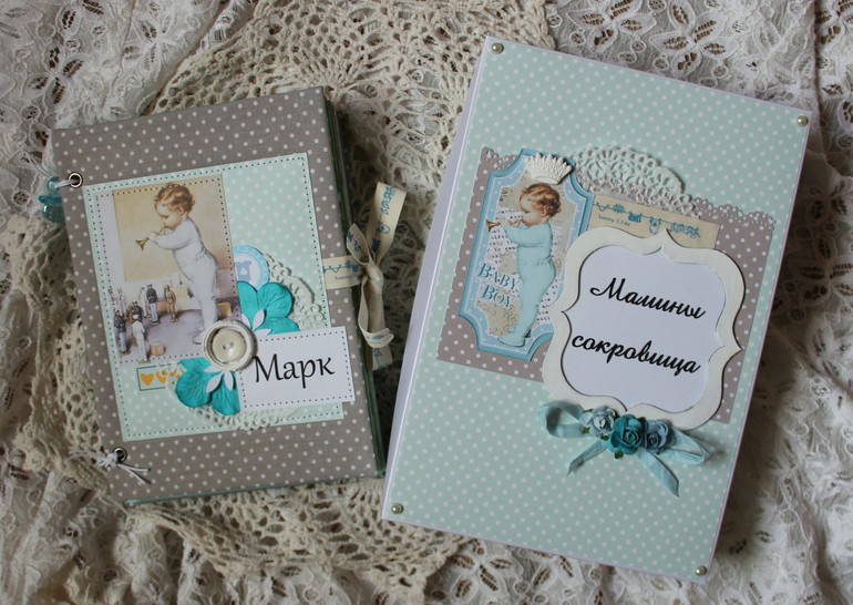 Готов у меня очередной детский заказ! :)Это комплект для малыша Марка. Комплект включает в себя: * большую коробку "Мамины сокровища" размером 18*26 см, в которой можно сохранить самые драгоценные вещи малыша: зубик,локон,соску,тест,снимок УЗИ,бирка с роддома и крестильный наряд. *детский альбомо-блокнот.Включает в себя разделители с местом для 21 фото фото малыша ( для каждого из 12 месяцев,выписка,крещение,первый новый год и др) , 8 карточек для записи важной информации/достижений,2 конверта -кармана.