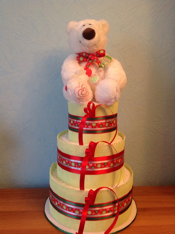Праздничный тортик составлен из подгузников Merries S 60 шт, прорезывателя, пустышки и клипсы для пустышек Avent, а также замечательного белого медвежонка. Такой тортик будет чудесным подарком для малыша и его родителей на Новый Год, Рождество или на рождение.