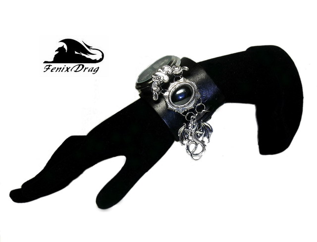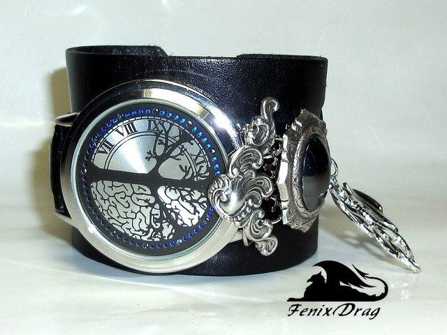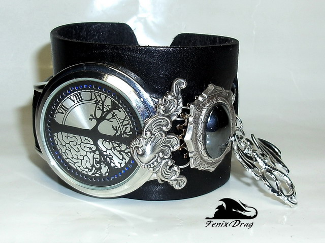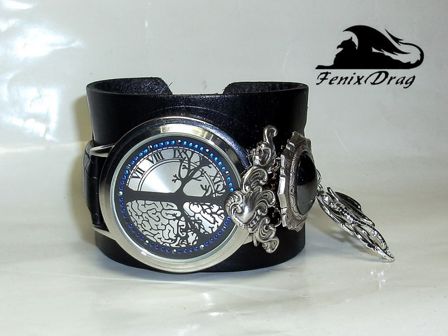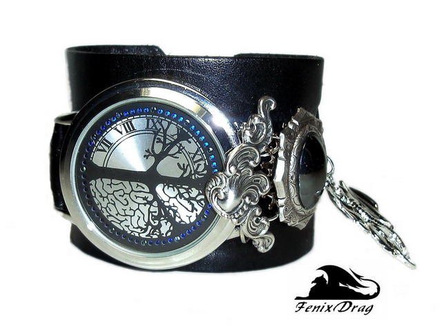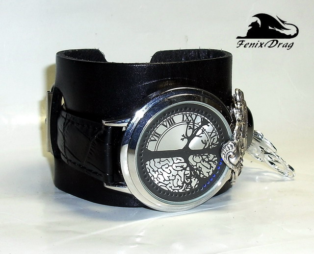 Стильный и модный браслет из черной кожи с сенсорными часами "Ева" ручная работа