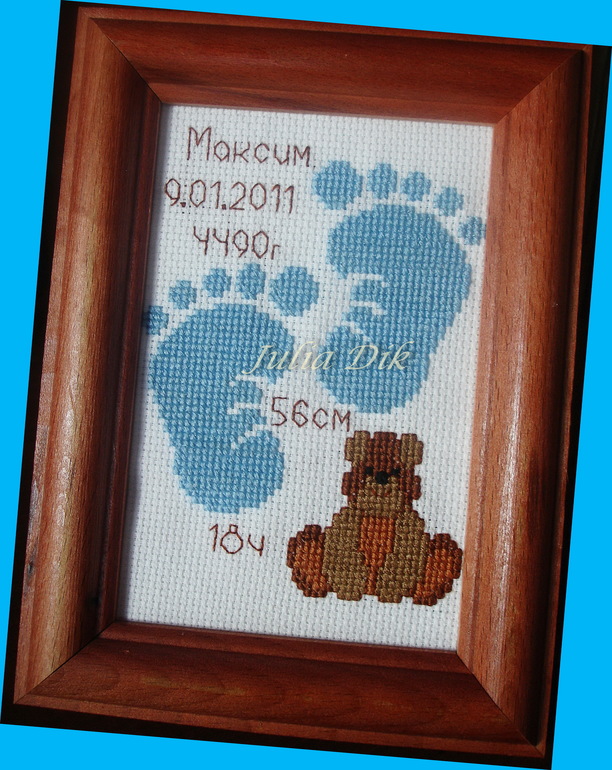 когда делаешь для кого-то,тем более сроки поджимали.т.к. вышивалось очень быстро ко ДР мальчика,то хоть ночь,хоть полночь-надо успеть,поэтому вот она,метрика с мишкой,сделанная с душой и любовью.очень понравилось,вроде просто,но эффектно!