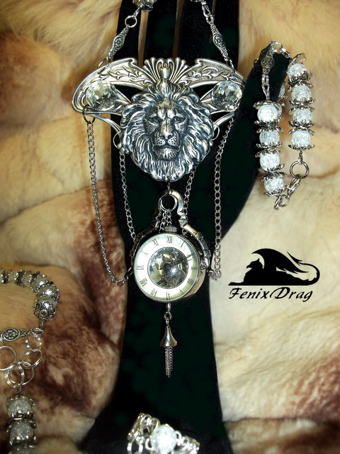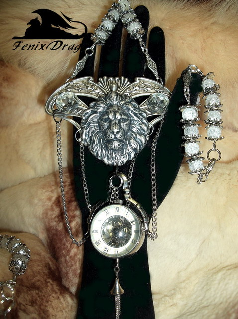 Колье и браслет+кольцо "Снежные львы Атлантиды" с механическими часами в стиле Фэнтази и Стимпанк/Steampunk