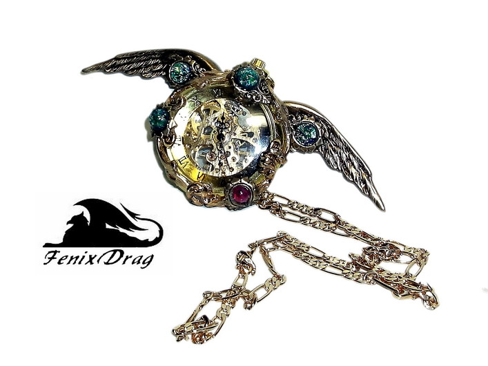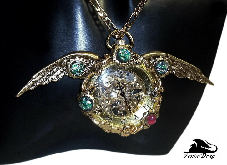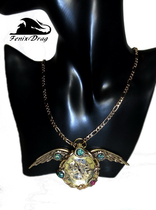 Кулон - золотистые механические часы "Маркиза" с крыльями ангела в стиле Стимпанк / Steampunk