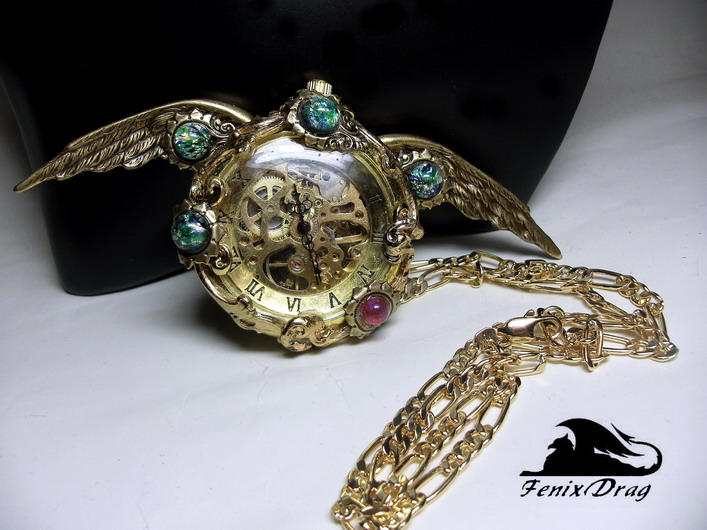 механические часы, винтажная латунь, позолота (позолоченная латунь), искусственные зеленые и красный опалы