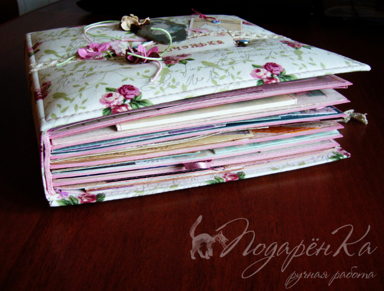 Пухленький и вместительный, с большим количеством "секретиков", кармашков, конвертов и пр., т.к. фотографий мне прислали огромное множество и хотелось как можно больше их разместить в альбоме))