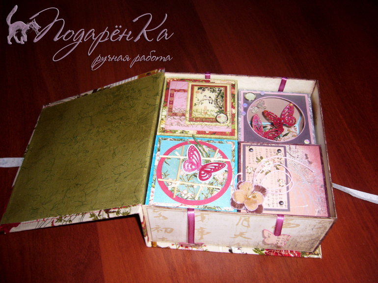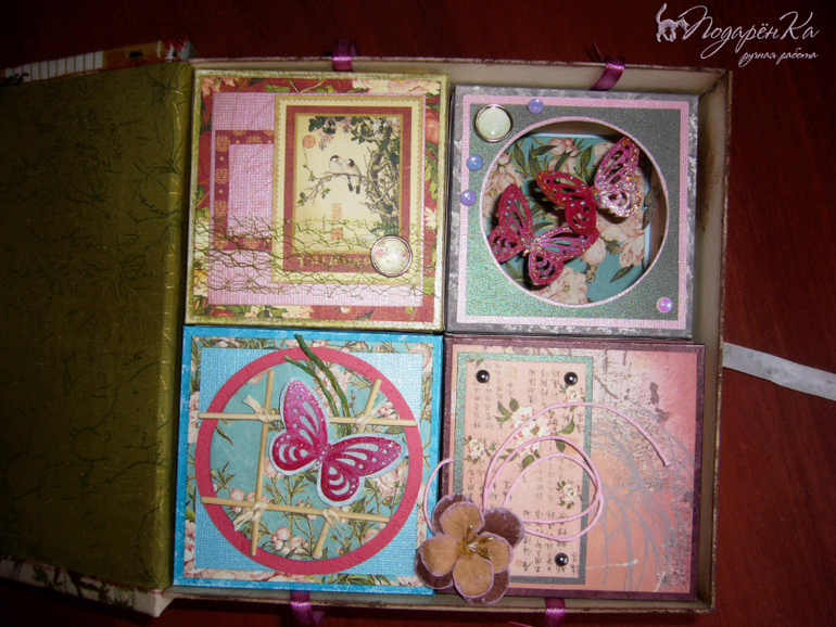 Скрапбукинг (альбомы, открытки и пр.)Шкатулка сделана по принципу "Маминых сокровищ". Тканевая обложка и три коробочки внутри + коробочка-открытка с бабочками. Ниже еще 5 фотографий))