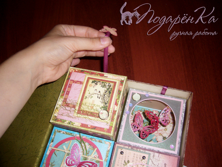 Шкатулка сделана по принципу "Маминых сокровищ". Тканевая обложка и три коробочки внутри + коробочка-открытка с бабочками. Ниже еще 5 фотографий))