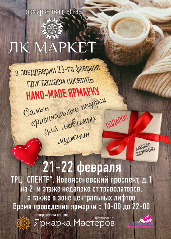 Каждый, кто занимается творчеством, может поучаствовать в Ярмарке Творчества "ЛК Маркет". Маркеты будут проходить 21-22 февраля в ТЦ "XL" на Ярославском шоссе и ТЦ "Спектр" м.Теплый Стан при партнерстве портала "Материнство" и "Ярмарка мастеров". Только для пользователей информационного портала "Материнство"и " Babyblog" нашим дорогим мамочкам скидка на участие в ярмарке от 10% до 20%!!!