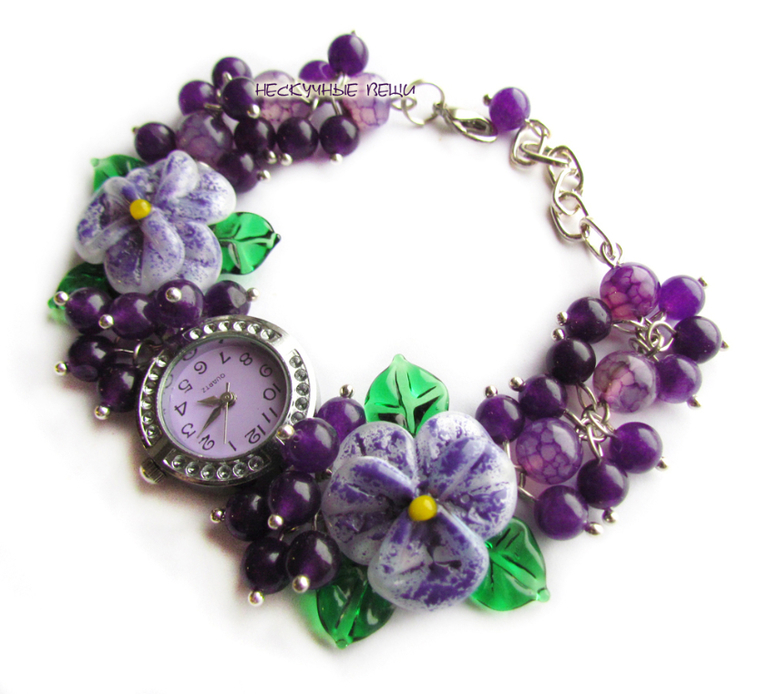 авторские бусины лэмпворк, агат, кварцевые часы, металлофурнитура