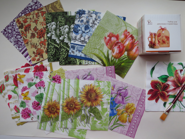 Салфетки 15 шт, набор для декупажа и кракелюра (грунт, клей, кракелюр, лак - все по 50 мл).