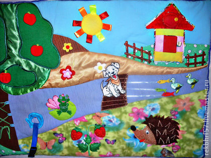 Куклы и игрушкиРазвивающий коврик - одеяло ждет своего владельца! Изготовлен вручную. Мягкий (несколько слоев синтепона), яркий, с качественной строчкой и развивающими элементами будет прекрасным подарком вашему малышу. Яблоки, солнышко и цветок на липучках. Много потайных кармашков. Шуршащее солнышко. На дереве есть шнуровка, чтобы развивать пальчики. Ремешок с застежкой позволяет прицеплять погремушку.