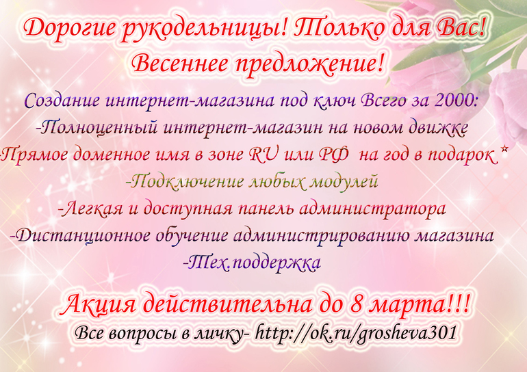 ПрочееЕсли Вы хотите продавать свои работы в интернете ,но не знаете как открыть интернет магазин-тогда Вам именно сюда! Спец.Предложение для мастериц!!!Подробности под катом Интернет-магазин с прямым адресом в доменной зоне ru или рф, ничего лишнего,никакой рекламы и баннеров на сайт без Вашего согласия,легкая,простая и доступная панель администратора . Разберется каждый!!! Все объяснения и обучение включено в стоимость,для примера покажу открытый и уже функционирующий магазин созданный мной