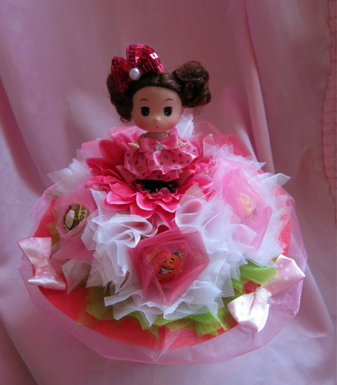 МИНИ-БУКЕТ ДЛЯ ДЕВОЧЕК( КУКОЛКА, 5 ЧУПСОВ И ДЕКОР), D-21СМ, ВЫС- 27СМ