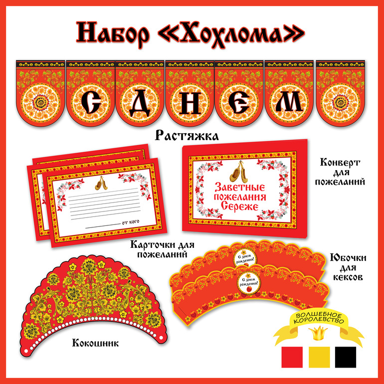 Оформление праздников, аксессуары для фотосессийНебольшой макет новой темы" Хохлома". Он замечательно подойдет для оформления дней рождений взрослых и детей, свадеб и девичников. Если вы давно мечтаете окунуться в прошлое своих далеких предков, то пора устроить вечеринку в русском народном стиле! С хлебосольными угощениями и веселыми гуляниями, в компании настоящих русских красавиц и задорных хлопцев. Отодвиньте рамки современного мира на задний план и проникнитесь традициями и ценностями русского народа.