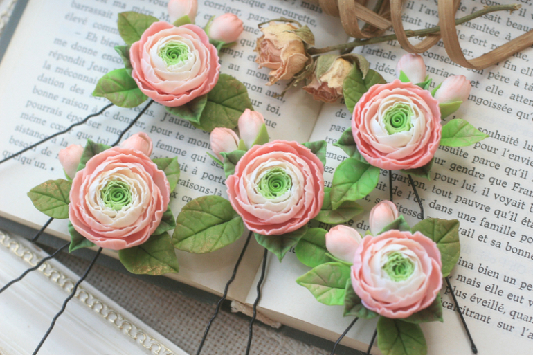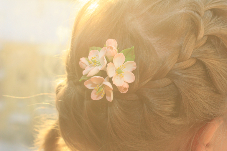 Пиончики вообще невесомые, розы потяжелее, у них лепестки потолщеТяжелые не сколько сами цветы, сколько металлическая фурнитураУ моей тоже волосики не густые, я ей делаю прически как на фото — косичку перехватываю резиночкой и над ней закалываю зажимОн не спадывает за счет того, что держится над резинкой и не мешает