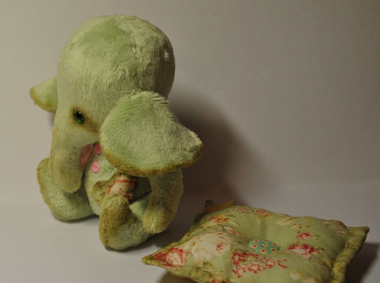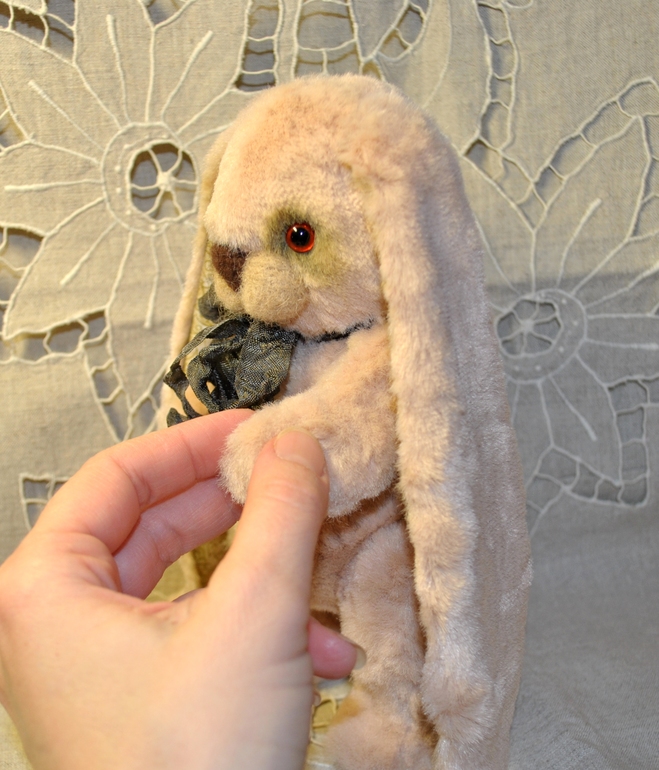 Лапки и головка на шплинтах, авторская выкройка. Набит синтетическим наполнителем, утяжелен стеклянным гранулятом. Глазки стеклянные.Носик акриловый. Сидя 13 см, стоя 15 см. Тонирован масл. красками.