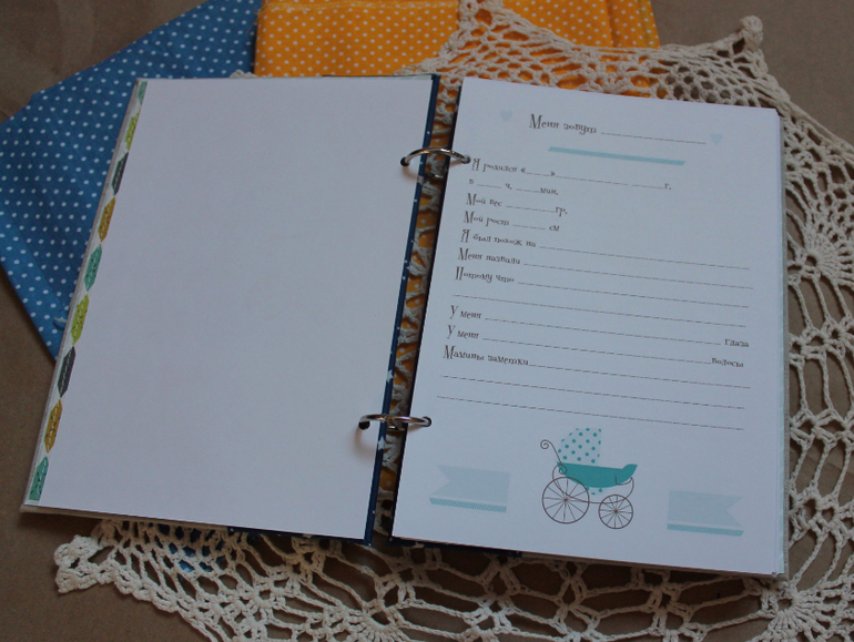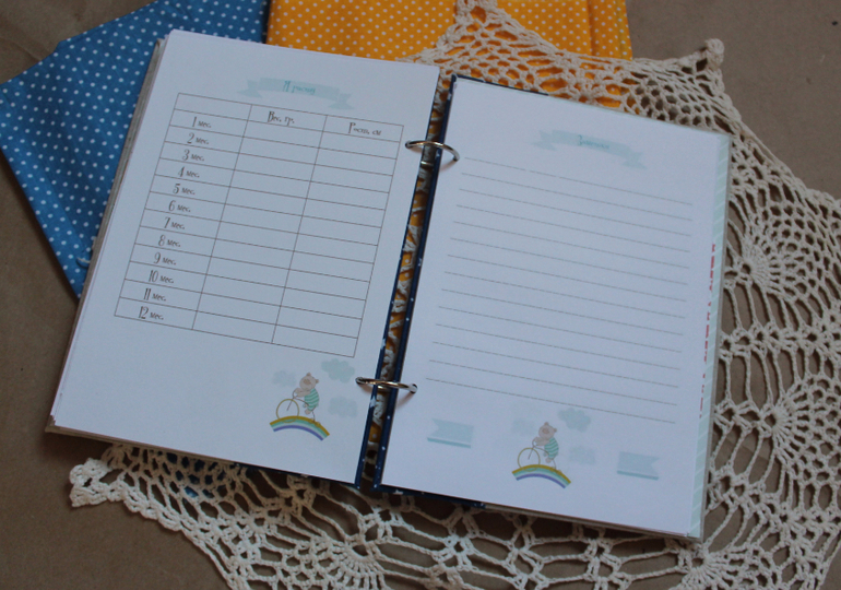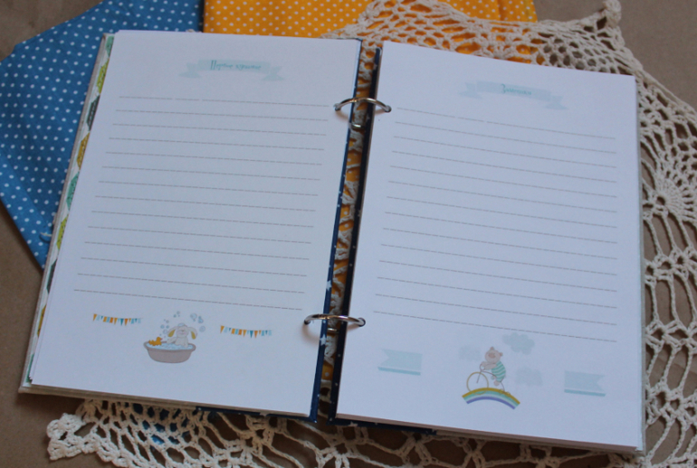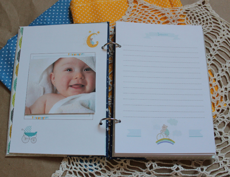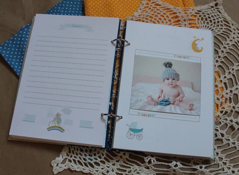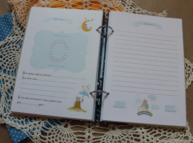 и лен на обложке-обалденное сочетание!!!внутри много-много дизайнерских страничек для записи достижений малыша:зубки,рост/вес,первые умения и тд. Также есть места для 8 фото и кармашки на форзацах
