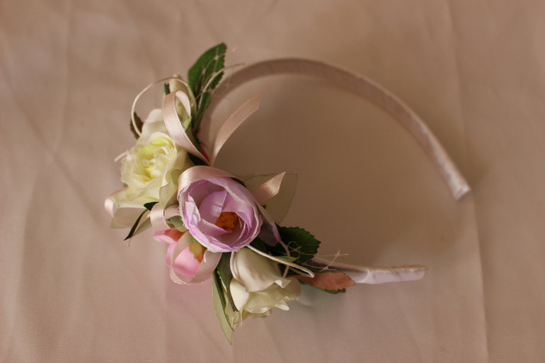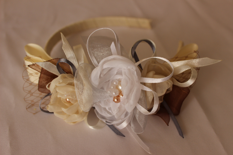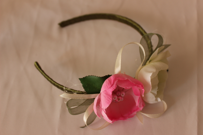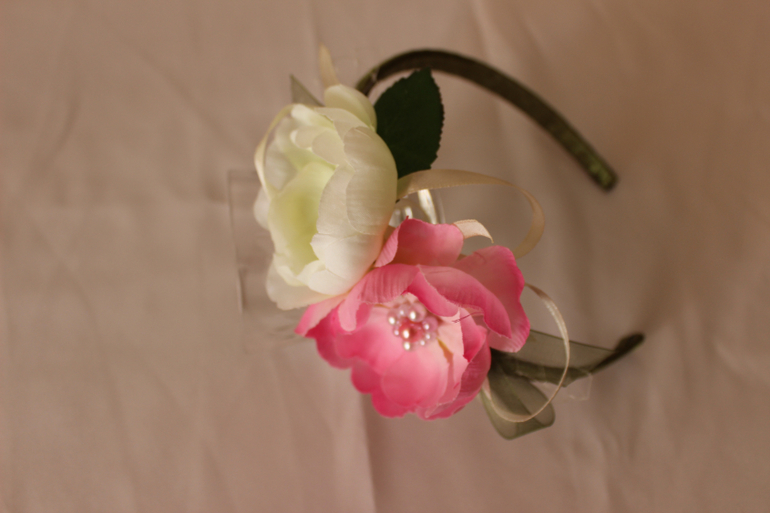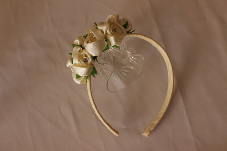 нет белых(( только мелкие розовые остались. могу ленту зеленую в компаньоны добавить, как в ободке. но мне бы на платье посмотреть... можно было бы три розочки сделать вставочку розовую, как в ободке..