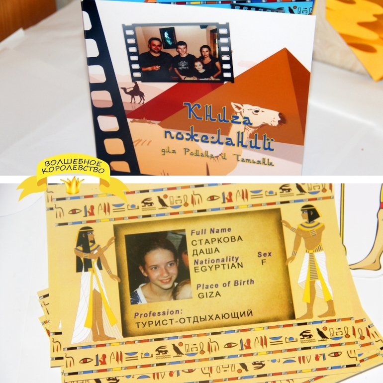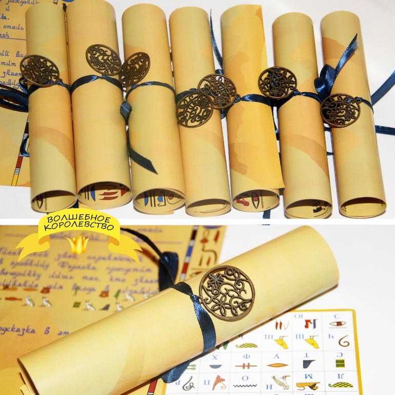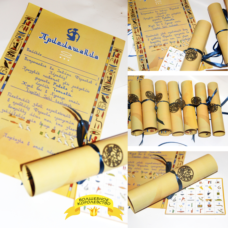 Приглашения-свитки с египетской шифровкой для гостей, египетские паспорта и удостоверения, тематическая фотобутафория, интересный сценарий и многое другое ждут вас в наборе для египетской вечеринки!