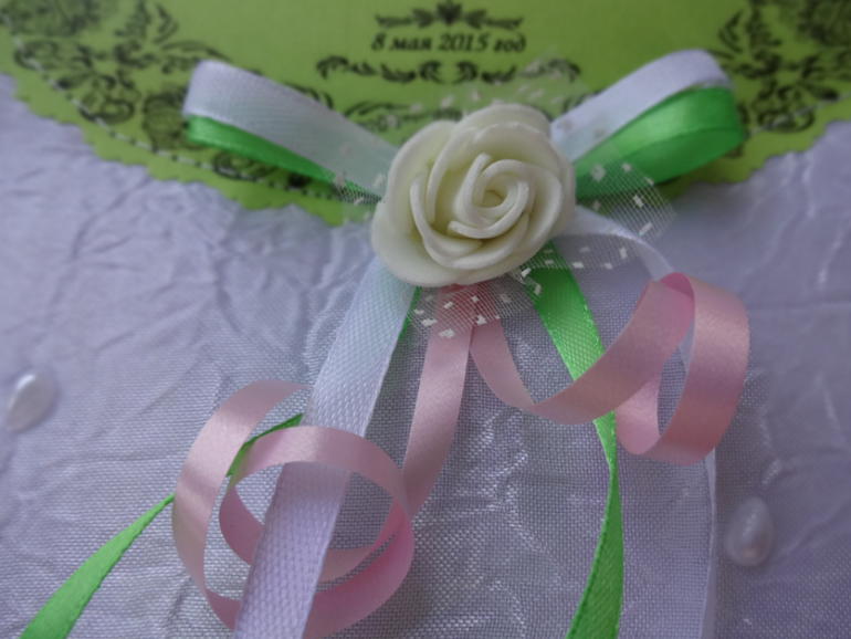 Папка для свидетельства о браке, есть резиночка - фиксатор, декор полубусинами, лентами, розочка из фома (готовая, покупная)