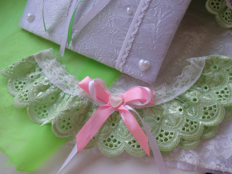Оформление праздников, аксессуары для фотосессийИтак, ещё одна часть свадебных аксессуаров "Свежесть весны": значки свидетелям, книга пожеланий, папка для свидетельства и подвязка, осталось ещё чуть-чуть, так что будет часть 3 :)