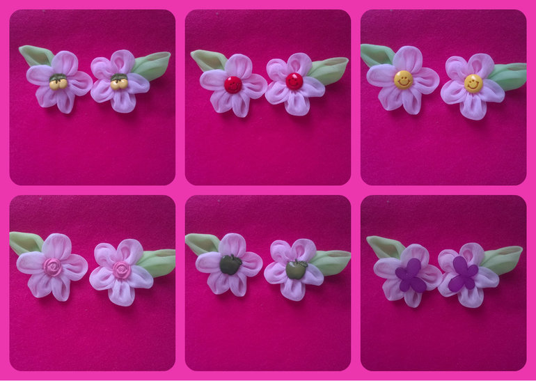цвета. Крепеж на выбор - зажим или резинка. 1 пара (2 шт) - 100 руб. При покупке 3-х пар любых цветов, 4-я в подарок. При необходимости вышлю увеличенное фото понравившейся заколки. Могу сделать аналогичный цветок на шляпку или на повязке на малышек.
