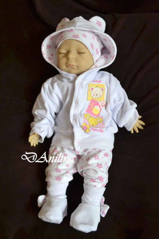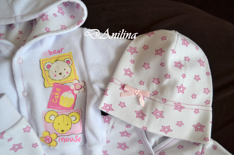 Комплект состоит из боди с коротким рукавом, ползунком, кофточки с капюшоном на подкладе, пинеток на подкладе, украшенных бантиком, трикотажной шапочки.
