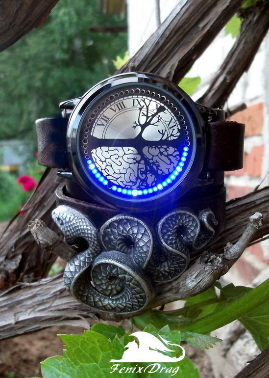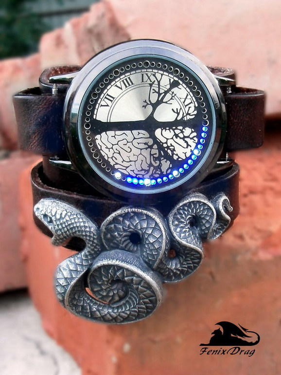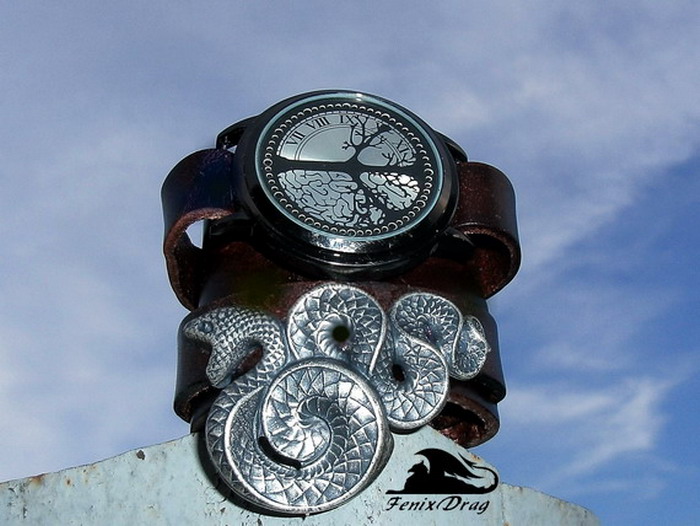 Широкий коричневый кожаный браслет "Ева. Эдем. Змея" ("Ева3") сенсорные часы