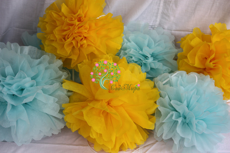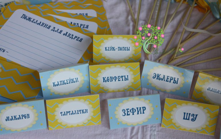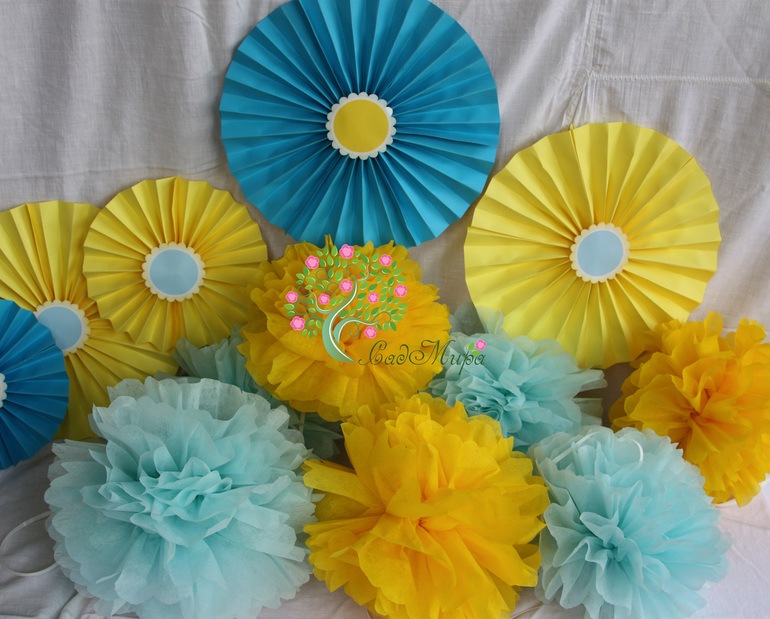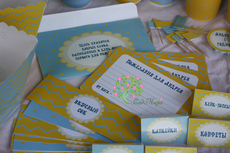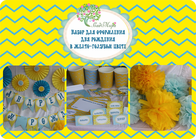 Оформление праздников, аксессуары для фотосессийНабор атрибутики для оформления дня рождения в желто-голубом цвете.