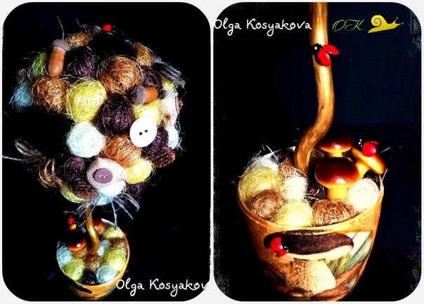 Все мысли уже о лете. Обожаю собирать грибы- это для меня самый лучший отдых, можно никуда не торопиться и наслаждаться запахом леса и дышать полной грудью пряным воздухом. Высота 44 см. Цена 1000 р. Использовались материалы: сизаль, бечевка, желуди, шишки, в качестве декора грибы и божьи коровки, горшок выполнен в технике декупаж.