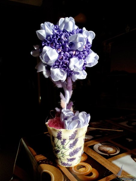 Тюльпаны и лаванда так прекрасно соединились в этом деревце, что проходя мимо, каждый раз хочется его понюхать и ощутить аромат лаванды и может быть, что кто-то его даже услышит, подсказанный памятью. Цена 800 руб. Высота 40 см. Топиарий создан из цветов ручной работы из атласных лент, бусины, ларгус и сизаль. Горшок выполнен в технике декупаж.