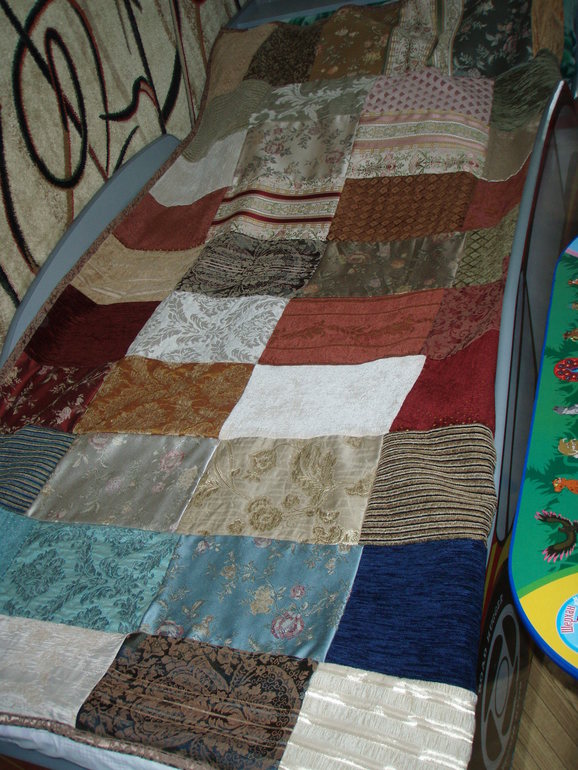 Вещь получилась весьма практиШная и вразмерная (у нас кровать-машина: длинная, узкая и с бортиками - с размерами плясали от нее). Удивительное рядом: лоскутки ушли все до одного - их хватило 1-в-1 (!!!).