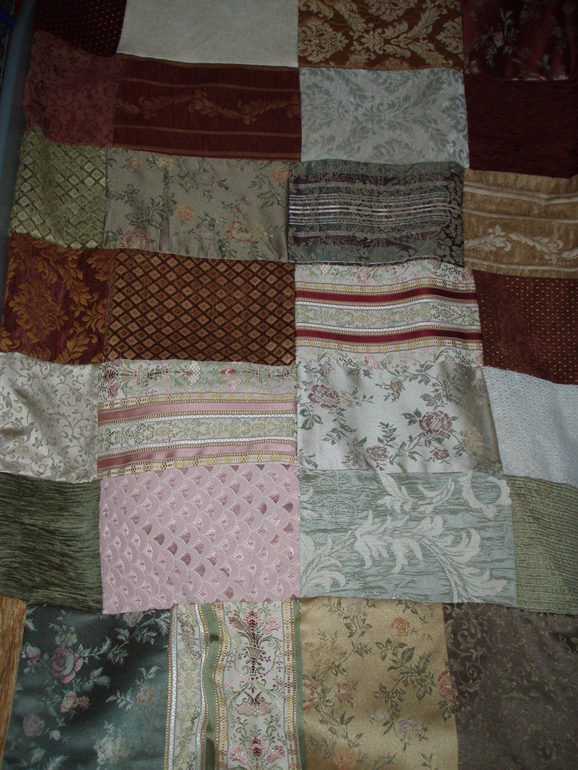 Текстиль для дома (шторы, постельное белье и т.д.)Зимой Наталья отдала мне целую кипу чудесных лоскутков - образцов мебельных тканей. Лоскутки были хороши текстурой и расцветкой, а также тем, что все они были примерно одного размера и с обработанными краями... ибо швея я в меру ленивая и не слишком умелая.