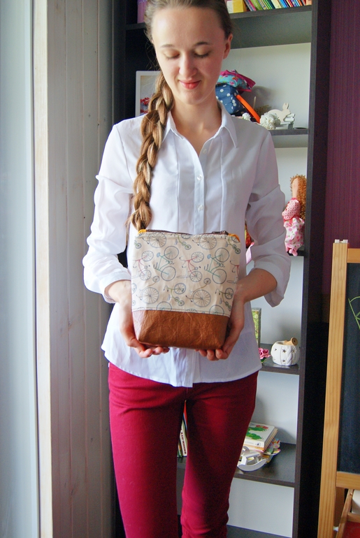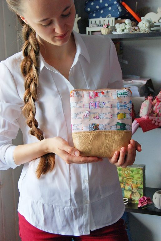 Косметичка в тон- на мощной тракторной молнии, дно- иск. кожа, ткань с зайчиками- водонепроницаемая.