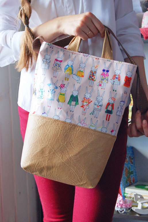 Шоппер "Rabbit" сравнительно небольшой, но с лиxвой помещает в себя формат А4. . Можно гулять с ней даже в дождик, ведь ткань и кожа водонепроницаемы))
