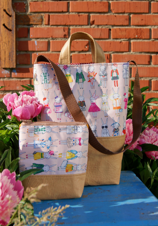 Дно и короткие ручки из искусственной кожи, ткань с зайчиками- водонепроницаемая , длинная ручка- стропа.