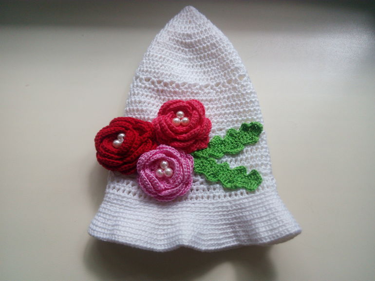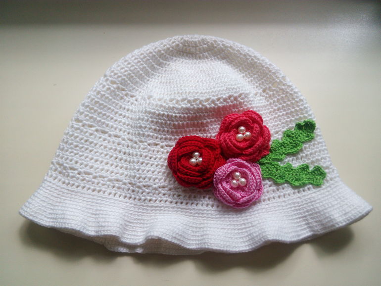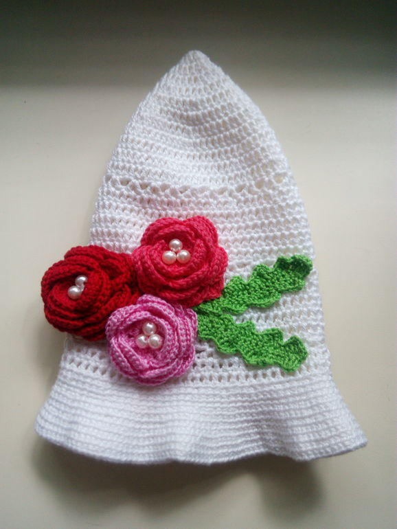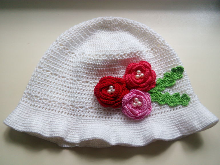 Панамка связана из пряжи "Нарцисс", розочки из пряжи "Коко", "Пехорка ажурная" и "Виолет", крючок 1,4.