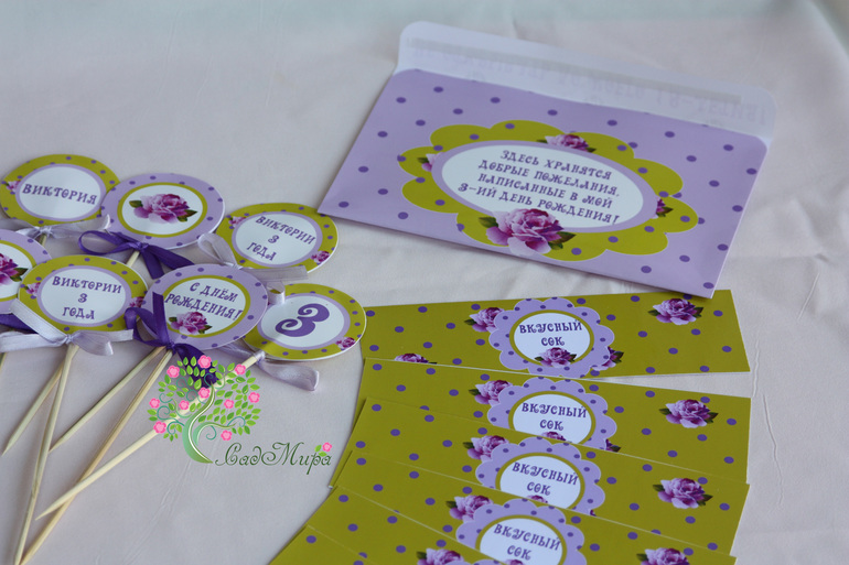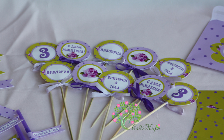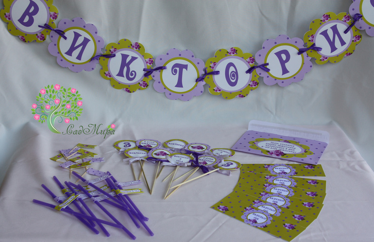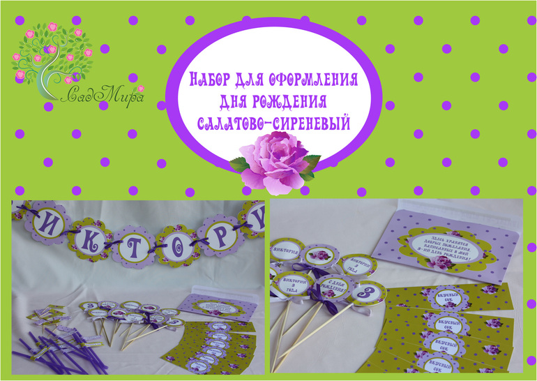 Оформление праздников, аксессуары для фотосессийНабор для оформления дня рождения в салатово-сиреневом цвете.