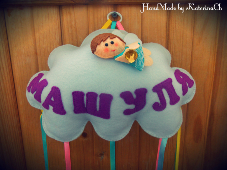 Во-вторых , приятности для малышки Маруси - именное панно и гирлянда. По просьбе мамы девочки - и панно, и буковки должны "звенеть". Просили - получайте) Бубенчики и колокольчики. Конечно же, всё крепко-накрепко пришито. Но, тем не менее, дети и пуговицы отгрызают. Поэтому, давать в ручки только под присмотром взрослых! Ну и ещё, как просили, метрические данные на звёздочках)