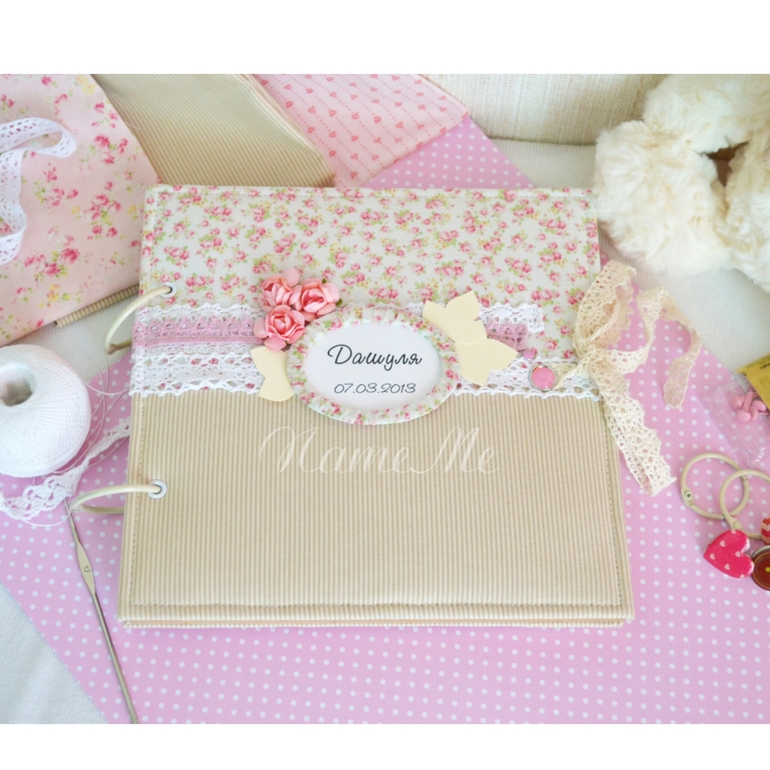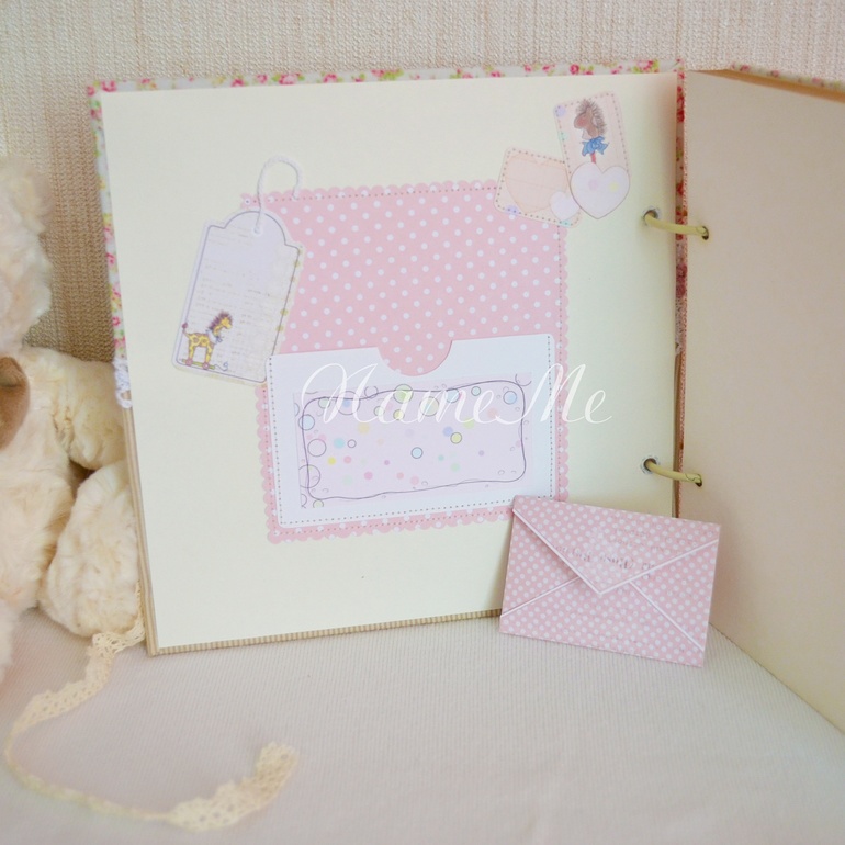 Добрый день! Свой первый пост я решила начать с вот такого фотоальбома. Размер альбомчика 20*20 см, 30 картонных листов. На внутренней стороне обложки есть карман для памятных вещиц малышки ))